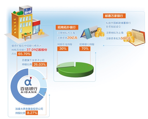 我国第一家独立法人的直销银行是百信银行,成立于2017年11月,由中信银行与百度发起设立。其原始注册资本金为20亿元,不久前该行增资扩股方案获批,根据方案,增资扩股后中信银即将合计持有百信银行37.01亿股股份,占该行本次发行后总股本比例为65.70%;加拿大养老基金投资公司持有股本比例为8.27%,百度旗下全资子公司持股比例为26.03%。