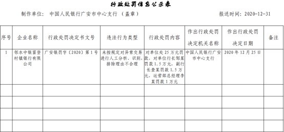 中国经济网350vip葡亰集团1月5日讯 中国人民银行成都分行网站昨日发布广安市中心支行行政处罚信息公示表(广安银罚字〔2020〕第1号),邻水中银富登村镇银行有限公司(以下简称“邻水中银富登村镇银行”)存在未按规定对异常买卖进行人工分析、辨认,扫除理由不合理违法违规行为,中国人民银行广安市中心支行对其处25万元?,对单位行长邹某?1.5万元,副行长查某?1.5万元,运营部总经理李某?1万元。