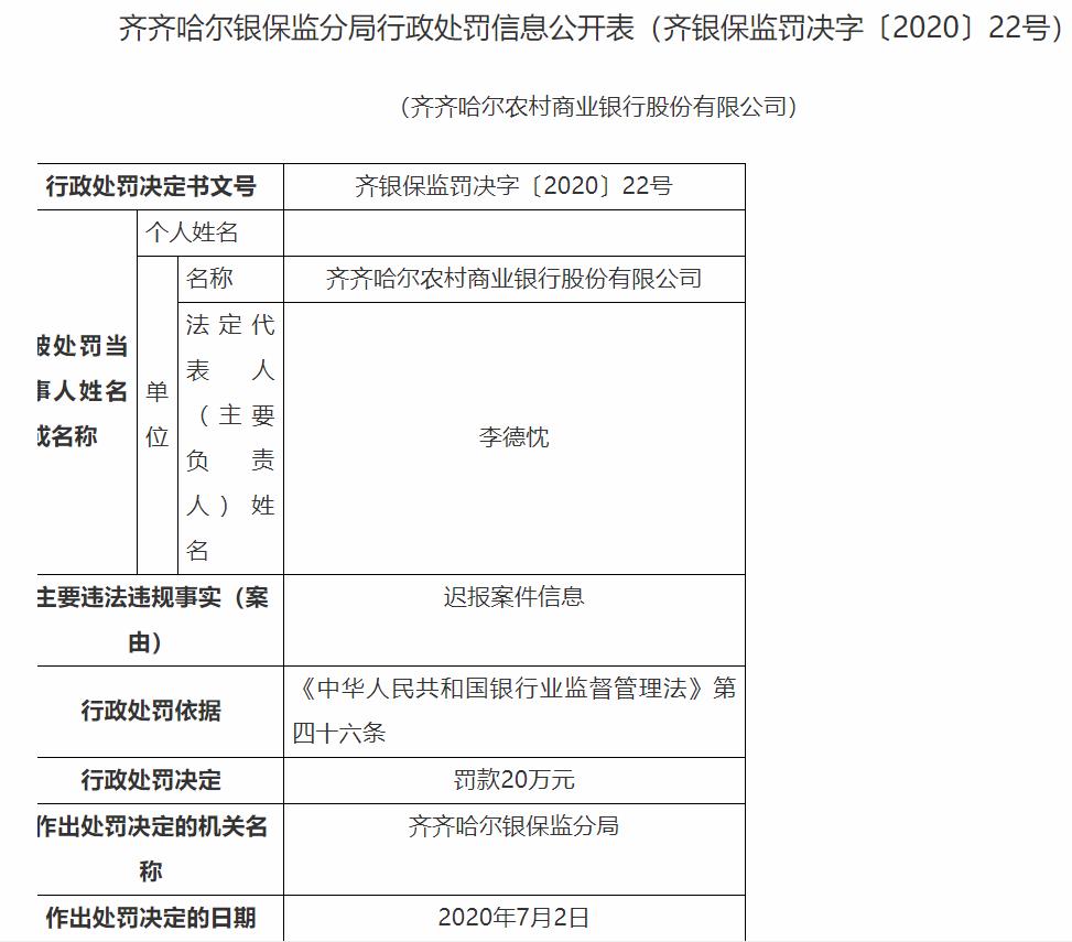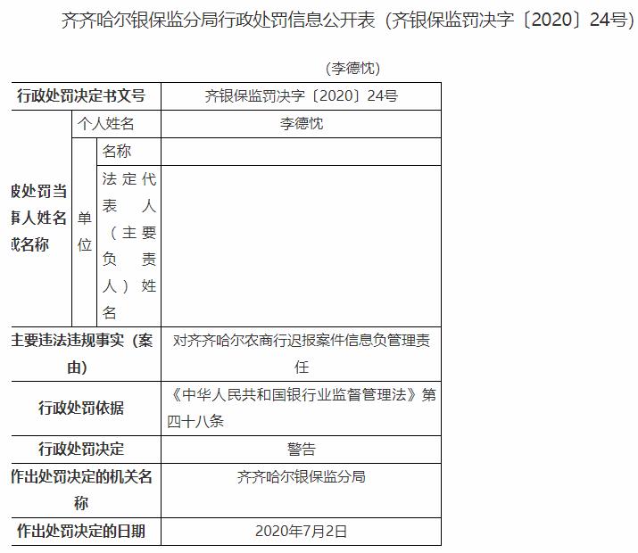 此外,中国银行保险监督管理委员会网站昨日公布的齐齐哈尔银保监分局行政处罚信息公开表(齐银保监罚决字〔2020〕24号)显示,当事人李德忱对齐齐哈尔农商行迟报案件信息负管理责任。齐齐哈尔银保监分局《中华人民共和国银行业监督管理法》第四十八条规定,对其警告。