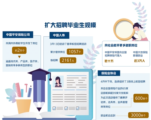 除了扩大招聘应届毕业生规模,众多保险公司还向社会敞开了更多就职岗位。例如,中国安全将面向全国招聘数十万保险代理人,中国大地保险新增近3万人就业。