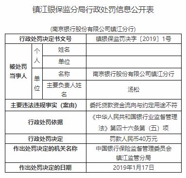 镇江监管分局行政处罚信息公开表(镇银保监罚决字〔2019〕1号)显示,南京银行镇江分行委托贷款资金流向与商定用途不符。根据《中华人民共和国银行业监督管理法》第四十六条第(五)项,镇江监管分局对该分行?钊嗣癖40万元。