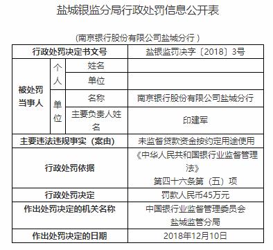 盐城监管分局行政处罚信息公开表(盐银监罚决字〔2018〕3号)显示,南京银行盐城分行未监督贷款资金按商定用途运用,根据《中华人民共和国银行业监督管理法》第四十六条第(五)项,被盐城监管分局?钊嗣癖35万元。
