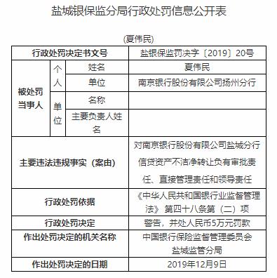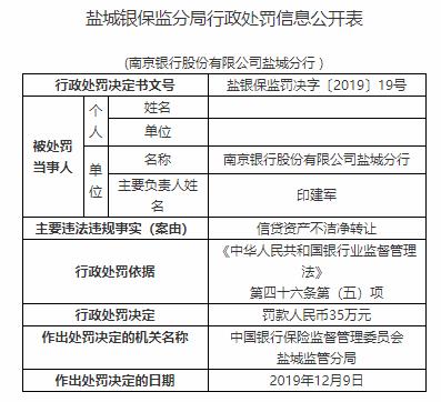 盐银保监罚决字〔2019〕19号显示,南京银行盐城分行信贷资产不洁净转让,根据《中华人民共和国银行业监督管理法》第四十六条第(五)项,被盐城监管分局?钊嗣癖45万元。