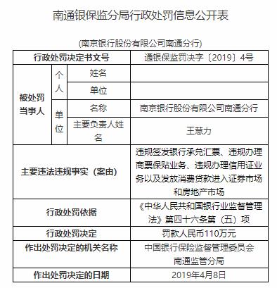 南通监管分局行政处罚信息公开表(通银保监罚决字〔2019〕4号)显示,南京银行南通分行存在以下违法违规理想:违规签发银行承兑汇票、违规办理商票保贴业务、违规办理信誉证业务以及发放消费贷款进入证券市场和房地产市场。根据《中华人民共和国银行业监督管理法》第四十六条第(五)项,南通监管分局对该分行?钊嗣癖110万元。