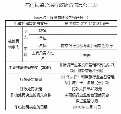 宿迁监管分局行政处罚信息公开表(宿银监罚决字〔2018〕6号)显示,南京银行宿迁分行非标资产业务投后管理不到位以及项目贷款管理不到位。根据《中华人民共和国银行业监督管理法》第四十六条第(五)项,宿迁监管分局对该分行?钊嗣癖48万元。