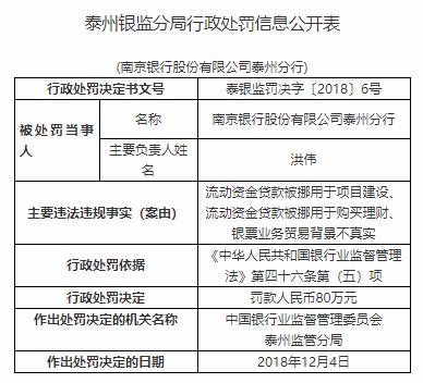 泰州监管分局行政处罚信息公开表(泰银监罚决字〔2018〕6号)显示,南京银行泰州分行存在以下违法违规理想:流动资金贷款被挪用于项目建设、流动资金贷款被挪用于购买理财、银票业务贸易背景不真实。根据《中华人民共和国银行业监督管理法》第四十六条第(五)项,泰州监管分局对该分行?钊嗣癖80万元。