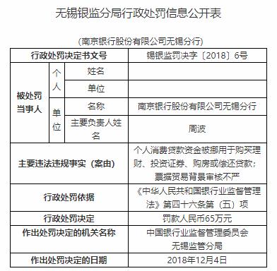 无锡监管分局行政处罚信息公开表(锡银监罚决字〔2018〕6号)显示,南京银行无锡分行存在个人消费贷款资金被挪用于购买理财、投资证券、购房或偿还贷款;票据贸易背景审核不严的违法违规行为。根据《中华人民共和国银行业监督管理法》第四十六条第(五)项,无锡监管分局对该分行?钊嗣癖65万元。