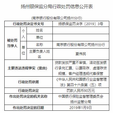 扬州监管分局行政处罚信息公开表(扬银保监罚决字〔2019〕3号)显示,南京银行扬州分行存在以下违法违规理想:贷款发放严重不谨慎,滚动签发银行承兑汇票、以票吸存、虚增存贷规模,客户经理违规代客保管。根据《中华人民共和国银行业监督管理法》第四十六条第(五)项,扬州监管分局对该分行?钊嗣癖90万元。
