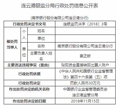 连云港监管分局行政处罚信息公开表(连银监罚决字〔2018〕3号)显示,南京银行连云港分行贴现资金直接转回出票人账户。根据《中华人民共和国银行业监督管理法》第四十六条第(五)项,连云港监管分局对该分行?钊嗣癖30万元。