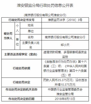 淮安监管分局行政处罚信息公开表(淮银监罚决字〔2018〕3号)显示,南京银行淮安分行存在以下违法违规理想:虚增贷款规模,多层嵌套规避资金监控。根据《金融违法行为处罚办法》第十六条第(三)项;《中华人民共和国银行业监督管理法》第四十六条第(五)项,淮安监管分局对该分行?钊嗣癖35.375万元,并没收违法所得10.375万元。