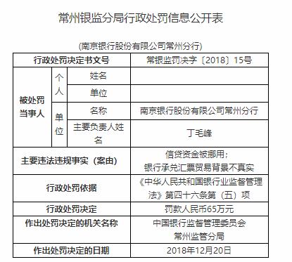 常州监管分局行政处罚信息公开表(常银监罚决字〔2018〕15号)显示,南京银行常州分行存在信贷资金被挪用;银行承兑汇票贸易背景不真实的违法违规行为。根据《中华人民共和国银行业监督管理法》第四十六条第(五)项,常州监管分局对该分行?钊嗣癖65万元。
