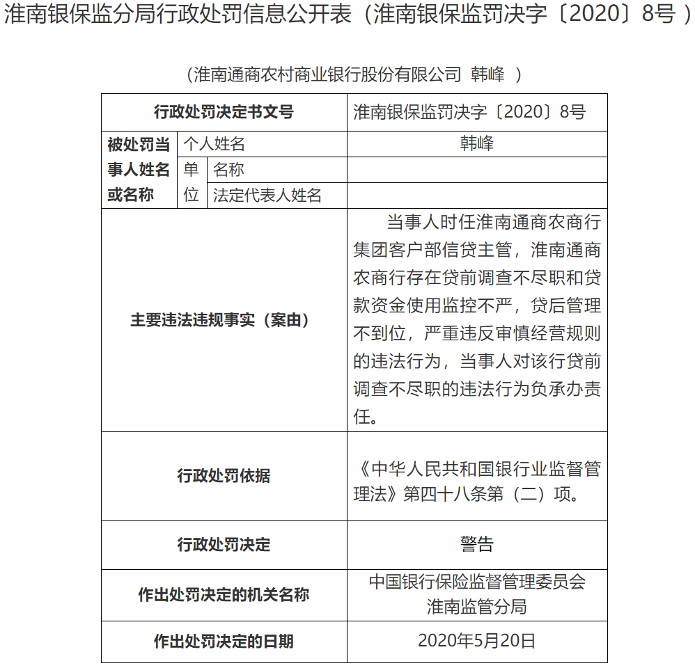 天津农商行内控管理不到位 原营业部老总被终身禁业