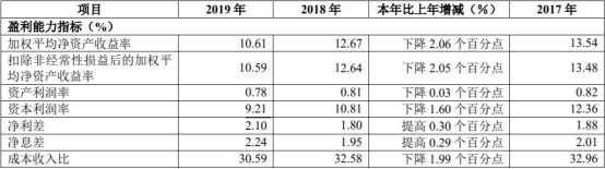 2019年,华夏银行加权均匀净资产收益率为10.61%,比上年下降2.06个百分点;扣除非经常性损益后的加权均匀净资产收益率为10.59%,比上年下降2.05个百分点;净利差为2.10%,比上年进步0.30个百分点;净息差为2.24%,比上年进步0.29个百分点。