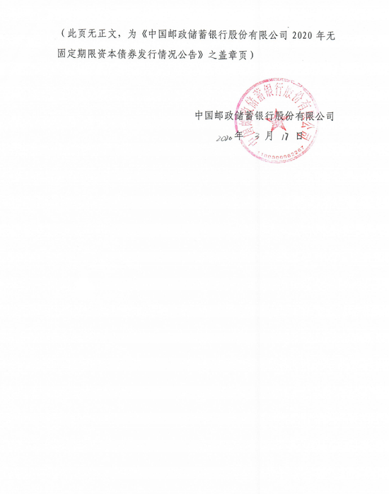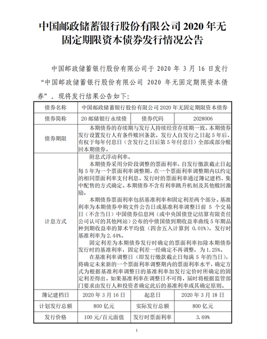 邮储银行成功发行800亿元永续债 票面利率为3.69%