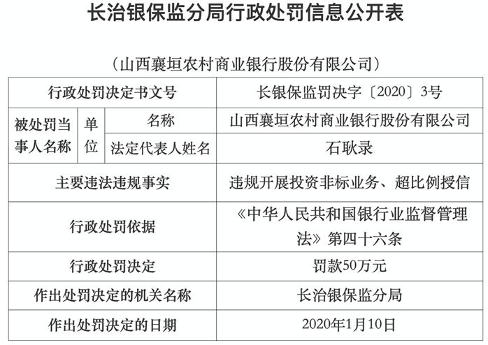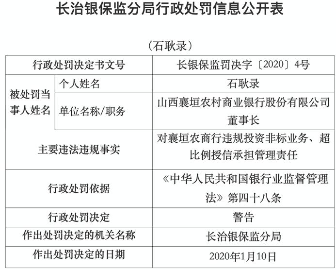 山西襄垣农商行两宗违法遭罚 董事长石耿录遭警告