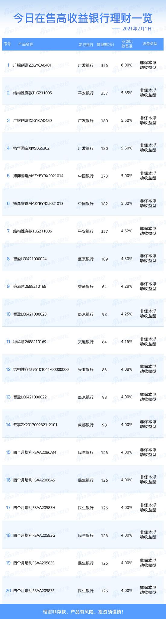 2月1日在售高收益银行理财产品:今日业绩比较基准在5%以上的银行人民币理财产品共7款。广发银行“广银创富ZZGYCA0481”业绩比较基准最高,为6.00%。