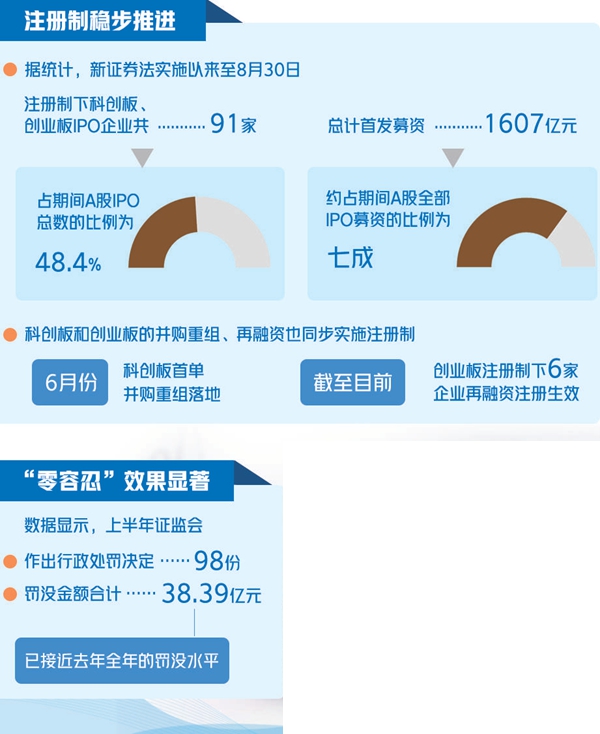 数据显示,上半年,证监会作出行政处罚决定98份,罚没金额合计38.39亿元,已接近去年全年的罚没程度。“零容忍”效果明显,离不开各项配套制度措施的不断落地。
