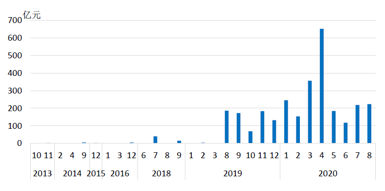 截至2020年8月末,共成交LPR利率期权382笔、789.7亿元。其中,LPR利率互换期权成交115笔、名义本金109.4亿元;LPR利率上/下限期权成交267笔、名义本金680.3亿元,下限成交130笔、下限成交137笔。从挂钩标的看,以1年期LPR利率为主,1年期LPR利率互换期权成交97笔、97.1亿元;1年期LPR利率上/下限期权成交254笔、667.2亿元。从期权期限看,集中在一年以内,利率上/下限期权以6个月期限为主,成交367.5亿元、占比54%,利率互换期权以1个月期限为主,成交56.8亿元、占比52%。