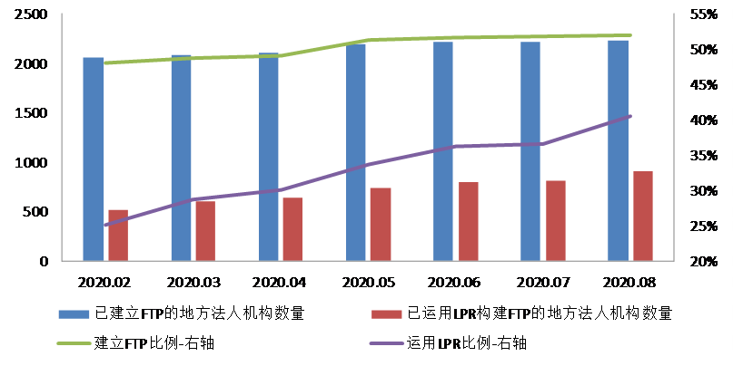 中国人民银行每月对金融机构在FTP中运用LPR的状况进行监测的结果显示:一是一切全国性银行均已建立FTP体系,并以LPR为定价基。岷媳呒首式鸪杀、期限、市场供求等要素,构建了贷款FTP动态调零件制,同时在FTP定价零碎中设置LPR影响参数,完成贷款FTP与LPR联动。2020年以来,24家全国性银行均下调了贷款FTP,下调幅度在0.2~0.5个百分点左右,其中绝大部分全国性银行贷款FTP的下调幅度等于或超过LPR降幅。二是地方法人金融机构中建立FTP并将LPR纳入FTP的机构不断添加。截至2020年8月末,52%的地方法人金融机构已建立FTP机制,较2月添加172家;其中41%的机构已将LPR纳入FTP,较2月添加389家。