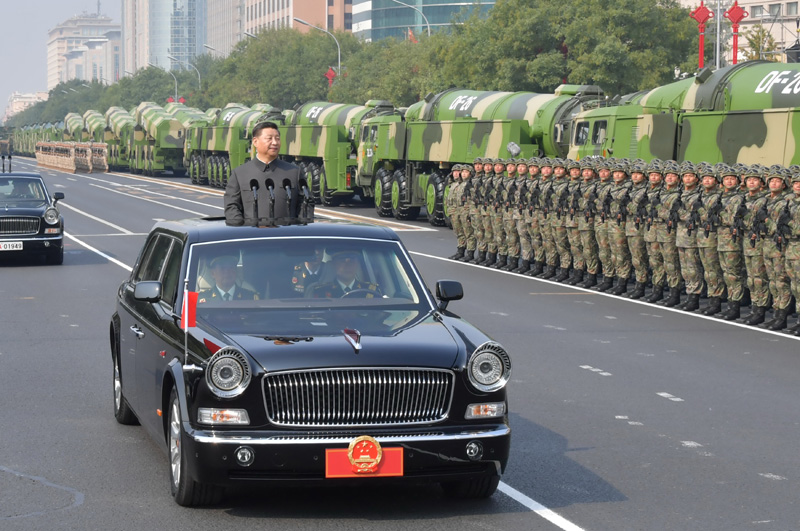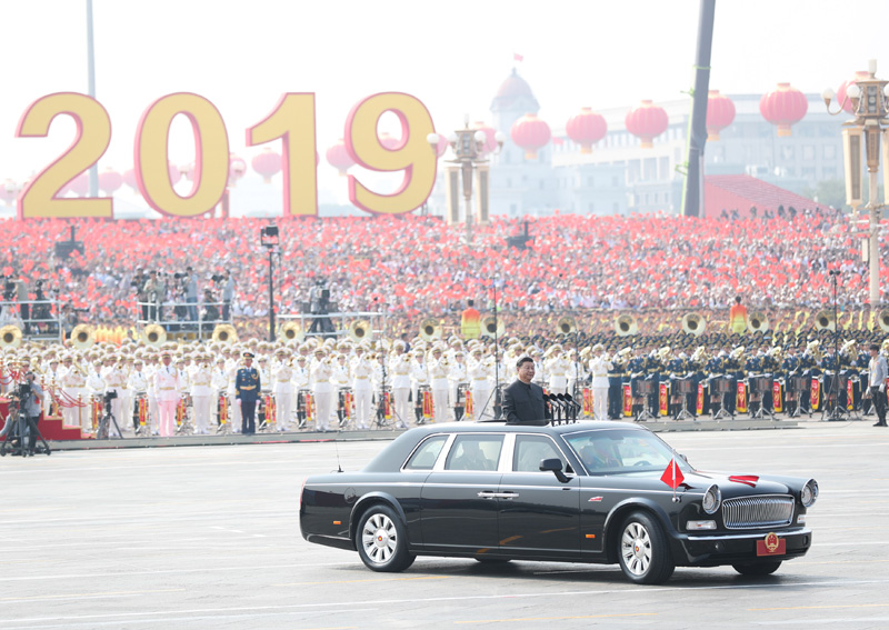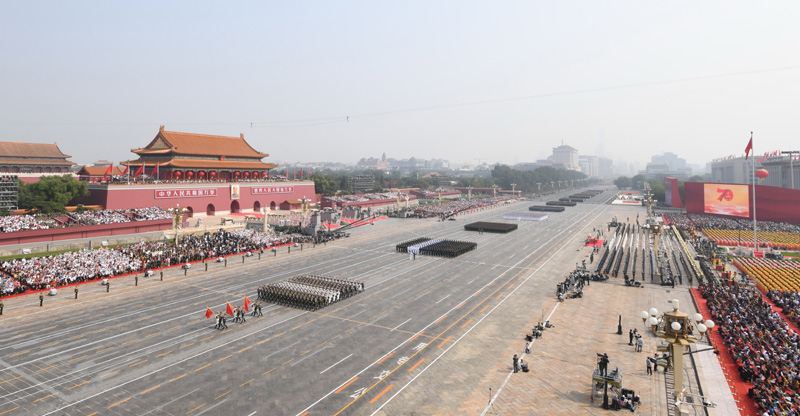 雄壮的军乐声中,习近平乘车沿着宽阔的长安街,依次检阅15个徒步方队、32个装备方队。近15000名受阅官兵划一列阵、英姿勃发,580台受阅装备在阳光下熠熠生辉。这是中国特征社会主义进入新时代的初次国庆阅兵,也是共和国武装力量改革重塑后的初次全体亮相。