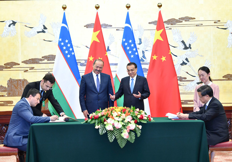 国务院总理李克强8月27日下午在人民大会堂同来华进行正式访问的乌兹别克斯坦总理阿里波夫举行会谈。