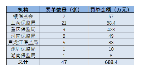 此外,重庆保监局、河南保监局、黑龙江保监局分别开出9张、8张、5张罚单,罚单总额分别为423万元、49万元、83万元,深圳保监局和湖南保监局各开出1张罚单,罚单总额分别为10万元和8万元。
