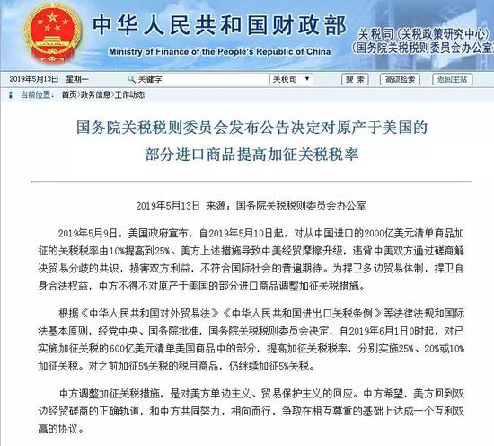 2019年5月9日,美国政府宣布,自2019年5月10日起,对从中国进口的2000亿美元清单商品加征的关税税率由10%进步到25%。美方上述措施导致中美经贸摩擦晋级,违犯中美单方经过磋商处理贸易分歧的共识,损害单方利益,不符合国际社会的普遍等待。为捍卫多边贸易体制,捍卫本身合法权益,中方不得不对原产于美国的部分进口商品调整加征关税措施。