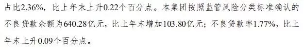 据年报显示,2018年,中信银行不良贷款余额640.28亿元,较上年末添加103.8亿元;不良贷款率1.77%,同比上升0.09个百分点。
