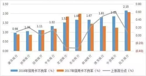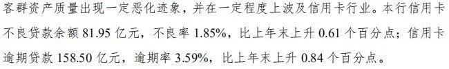 据年报显示,2018年信誉卡发行量增速一举超过“零售之王”招商银行及新晋零售玩家安全银行。其后果就是不良贷款额与不良贷款率“双升”,成为公布不良贷款率的多家银行中,不良率增幅最大的银行,同比增幅达到0.61%。。
