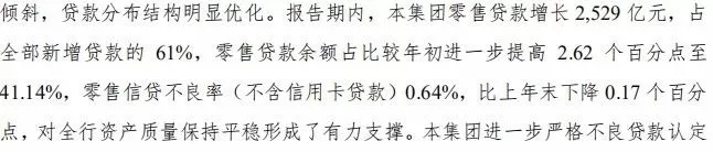 据中信银行2018年报显示,公司2018年零售贷款余额占比较年终进一步进步2.62个百分点至41.14%,零售信贷不良率(不含信誉卡贷款)0.64%,比上年末下降0.17个百分点,对全行资产质量保持颠簸构成了有力支撑。