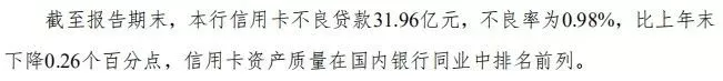 此外,有意思的是,据2018年半年报显示,中信银行上半年末信誉卡坏账31.96亿元,不良率0.98%,比2018年年终时还低,且尚未披露逾期率。中信银行曾夸耀其信誉卡风控才能,自称信誉卡质量在国内银行同业中排名前列。而仅仅过去半年工夫,中信信誉卡坏账余额就涨了156%,不良率涨了0.87个百分点。