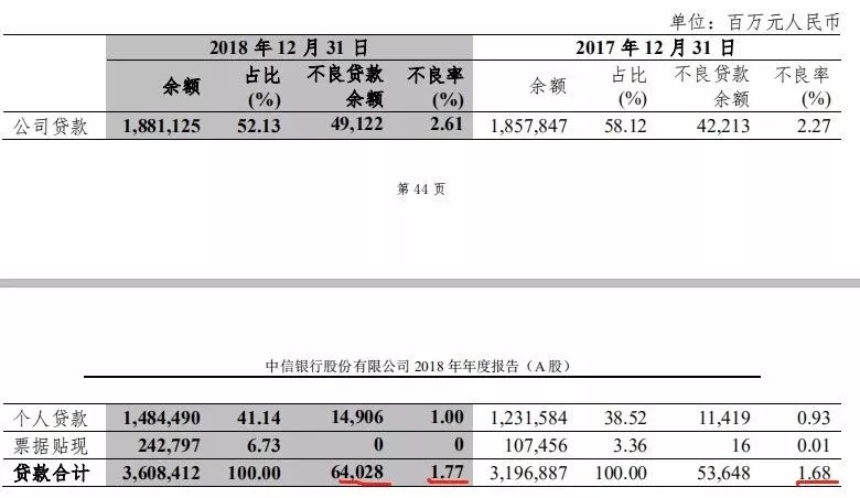 相比而言,其3月底发布的2018年年度报告更耐人寻味。在零售转型大背景下,各家银行的信誉卡发卡量、买卖额均有上升的,随之而来的是不良率的不断攀升,中信银行则是最典型的代表之一。