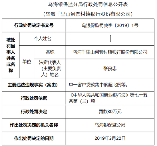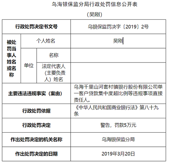 乌海银行旗下2村镇银行违法 一行长被取消任职资历5年