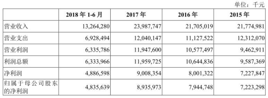 2014年、2015年、2016年、2017年、2018年1-6月,重庆农商银行营业支出分别为197.10亿元、217.75亿元、217.05亿元、239.88亿元、132.64亿元;归属于母公司股东的净利润分别为68.28亿元、72.23亿元、79.45亿元、89.36亿元、48.36亿元。