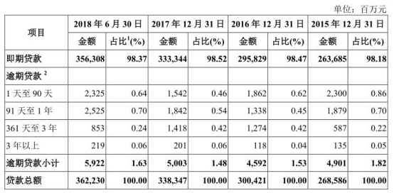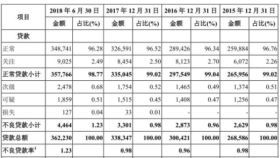 招股书显示,2014年末、2015年末、2016年末、2017年末、2018年6月末,重庆农商银行不良贷款余额分别为18.87亿元、26.29亿万、28.73亿元、33.01亿元、44.64亿元;不良贷款率分别为0.78%、0.98%、0.96%、0.98%、1.23%;逾期贷款分别为30.20亿元、49.01亿元、45.92亿元、50.03亿元、59.22亿元。
