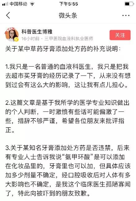 目前,科普医生博雅的这则微博曾经删除。“关于某知名牙膏添加处方药能否违禁,后来有专业人士(化妆品配方师)告诉我说‘氨甲环酸’是可以添加在化妆品里的,牙膏里也可以加,但具体应该加多少剂量不确定,经口腔吸收后对人体有多大影响也不确定……”在一则声明中,该名医生这样指出。其还表示,关于这种牙膏起止血作用的成分,到底是中草药还是止血的处方药,其还无从得知,也在等待官方回复。