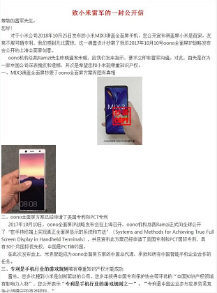 在这封题为《致小米雷军的一封公开信》的公告中,米界称,小米MIX3滑盖片面屏手机设计抄袭了米界于2017年oono片面屏IP战略发布会公开的上海片面屏创意,并发布了两款手机的对比图,表示“有图有真相”。