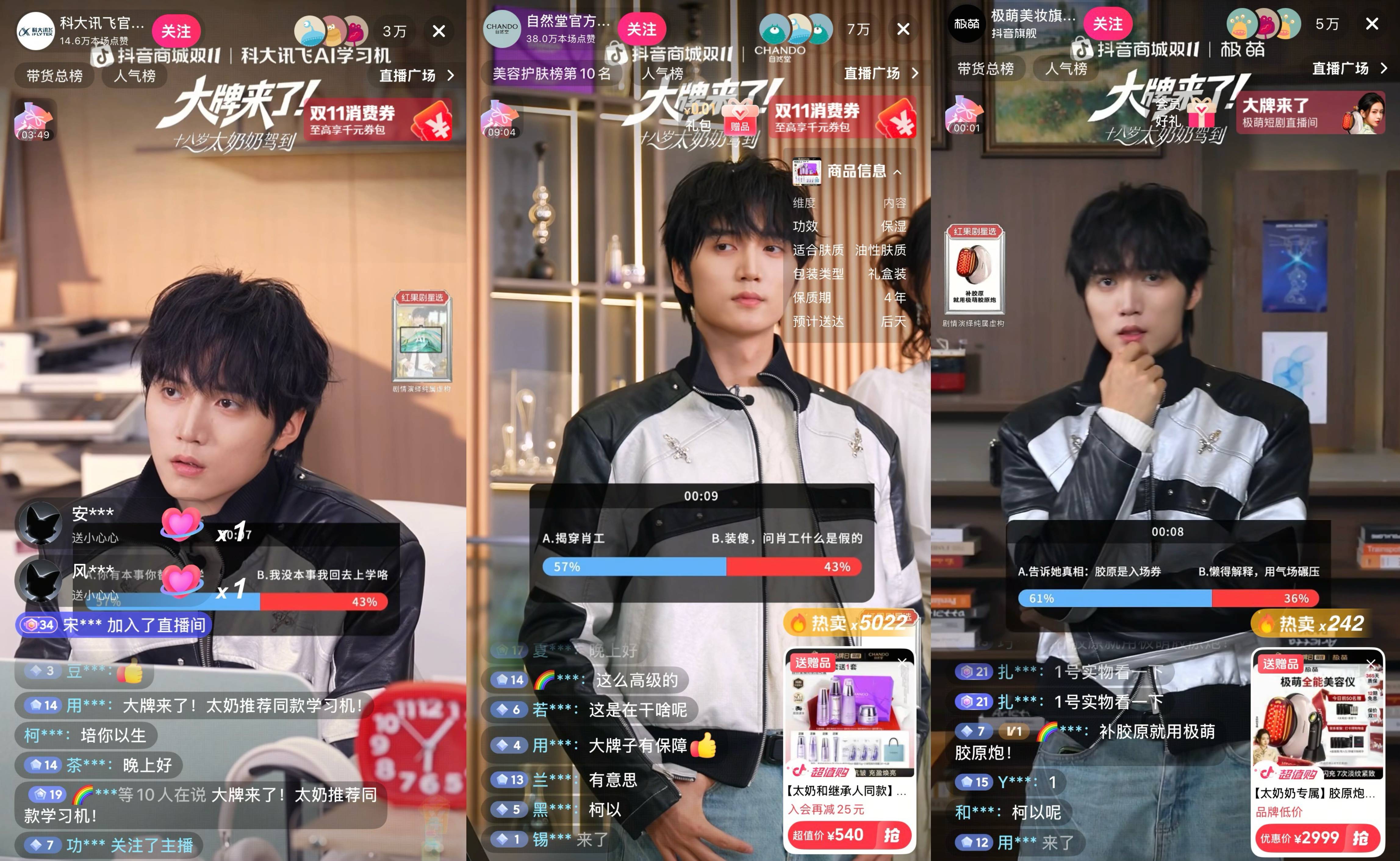 互动之后跳出的品牌优惠就像解锁故事彩蛋一样自然。科大讯飞AI学习机破解难题时,大家都在玩“纪总缺家教吗?”的梗;看到极萌胶原炮的即时效果,弹幕和评论区直接开始“求同款锋利下颌线”……品牌在故事中自然显露,处理痛点的同时完成种草,将更多用户分流引向各个品牌直播间。