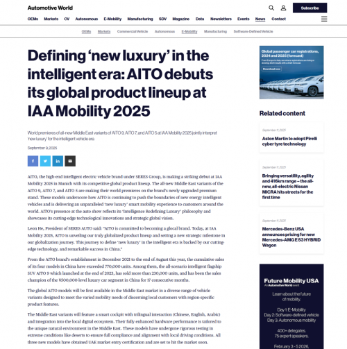 海外媒体尤其关注AITO的市场表现。Onliner.by报道称,中国350vip葡亰集团品牌正以微弱实力应战欧洲传统豪华车企,其中AITO表现尤为亮眼,其在中国高端市场已完成对宝马、奔驰等品牌的超越。YalaMotor则指出,AITO“软件定义350vip葡亰集团”与科技豪华理念已成为全球化战略的核心支撑。