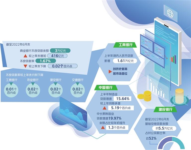 上半年,我国商业银行信贷资产质量基本波动。最新监管数据显示,截至2022年6月末,商业银行不良贷款余额3万亿元,较上季末添加416亿元;不良贷款率1.67%,较上季末下降0.02个百分点。从已披露的半年报数据看,截至2022年6月末,工商银行、农业银行、建设银行、交通银行的不良贷款率有所下降,分别较上年末下降0.01个百分点、0.02个百分点、0.02个百分点、0.02个百分点,中国银行不良贷款率较上年末微升0.01个百分点。