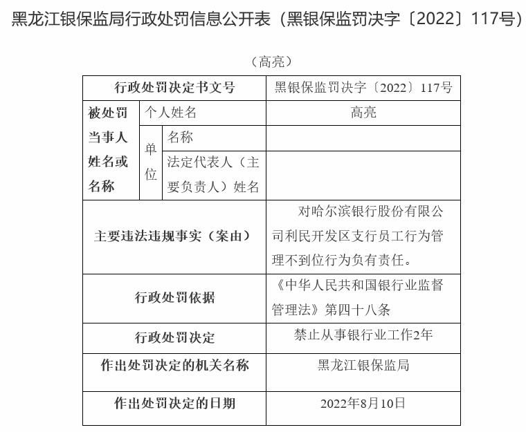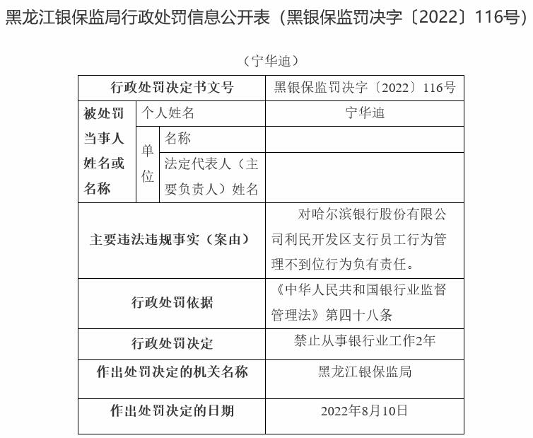 哈尔滨农商银行南极支行违法被罚