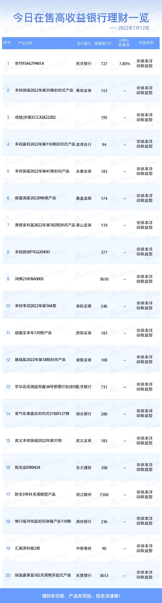 银行12日在售高收益理财产品一览