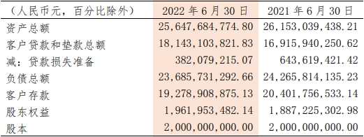 截至2022年6月30日,辽宁复兴银行资产总额256.48亿元,去年同期为261.53亿元;客户贷款和垫款总额181.43亿元,去年同期为169.16亿元;负债总额236.86亿元,去年同期为242.66亿元;客户存款192.79亿元,去年同期为204.02亿元。