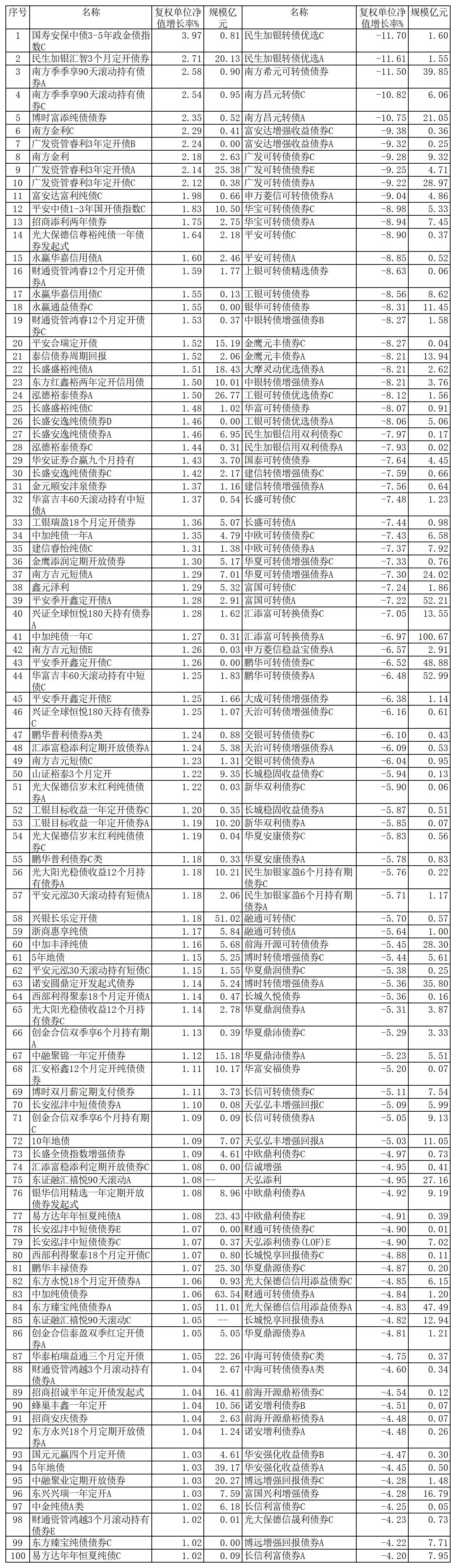 排名其后的基金分别是民生加银汇智3个月定开债券、北方季季享90天滚动持有债券A、北方季季享90天滚动持有债券C、博时富添纯债债券、北方金利C、广发资管睿利3年定开债B、北方金利、广发资管睿利3年定开债A、广发资管睿利3年定开债C,涨幅分别是2.71%、2.58%、2.54%、2.35%、2.29%、2.24%、2.18%、2.14%、2.12%。这些债基都为纯债基金,持仓次要是政策性金融债、企业债。