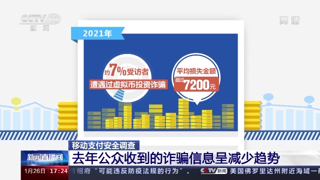中国银联风险控制部高级总监 王宇:国家监管部门出台了多项的管理措施,公安机关也开展了多次打击举动。所以说在(收到)诈骗信息上、损失上,这两个目标应该说都有明显的改善。同时,2021年的移动领取风险也有一些新的变化,网络直播诈骗、虚拟币投资诈骗,这两类风险应该说占比还是比较高的。