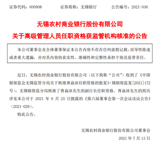 无锡银行:副行长陈晖辞职 聘任陈稔为副行长