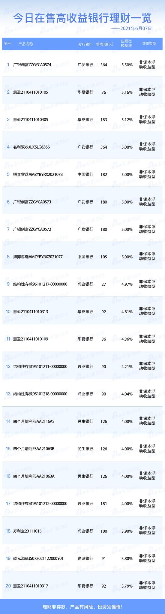 新浪财经6月7日在售高收益银行理财产品:今日业绩比较基准在5.0%以上的银行人民币理财产品共8款。广发银行的“广银创富ZZGYCA0574”业绩比较基准最高,为5.50%。