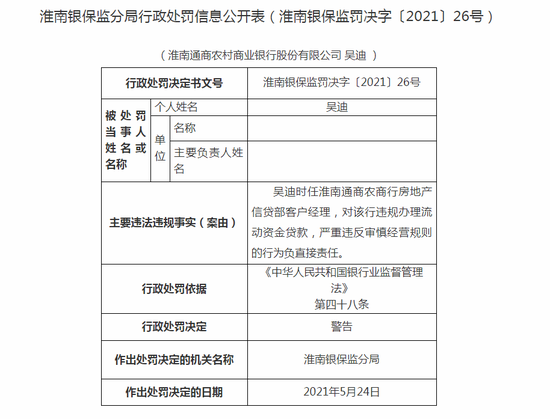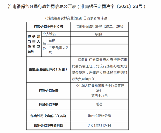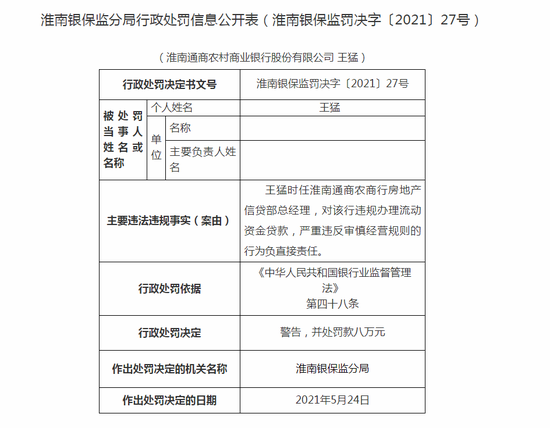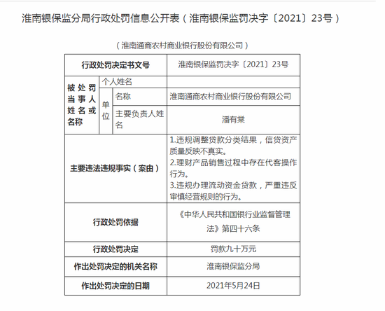 淮南通商农商行违法遭罚50万