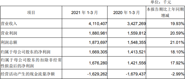 同日,成都银行还披露了2021年第一季度报告。2021年1-3月,成都银行完成营业支出41.10亿元,同比增长19.93%;归属于母公司股东的净利润16.69亿元,同比增长18.10%;归属于母公司股东的扣除非经常性损益后的净利润16.76亿元,同比增长17.92%;运营活动产生的现金流量净额-16.29亿元,同比增长2.99%%。