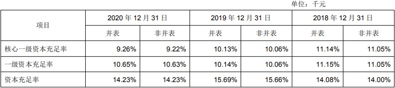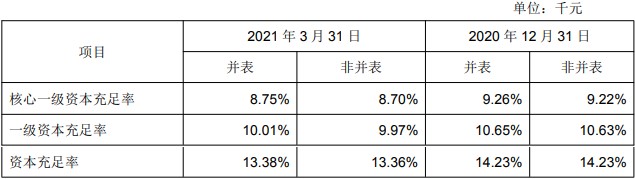 截至2021年3月末,成都银行的资本充足率为13.38%,较上年末下降0.85个百分点;一级资本充足率为10.01%,较上年末下降0.64个百分点;核心一级资本充足率为8.75%,较上年末下降0.51个百分点。